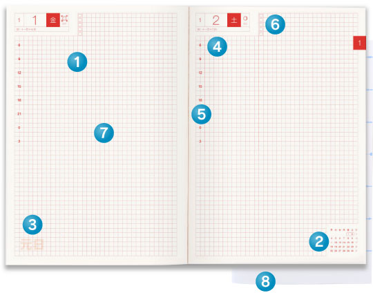 1日ページの時間軸には、時間をしめす数字が 3時間ごとに入っています。 数字のない時間帯の予定を書き込むときに、 「時間軸の部分にも方眼があると、 引き出し線を引く目安になる」と、 ユーザーの方に教えていただきました。 きれいに書きたいときは目安にもなる方眼は、 ここでも有効に使われていたんですね。