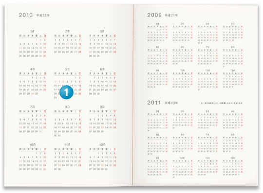月ごとに1日ページの色が変わるのも、 「ほぼ日手帳」の特徴のひとつです。 12カ月、12種類の色を使っているため、 1日ページ以外のページの色は、 どの月の色にもかたよらないように グレーを基調にしています。 2010年は、グレーの色味を少し調整して 目にやわらかなブルーグレーにしました。 休日の赤とバランスもよく、軽やかな雰囲気です。