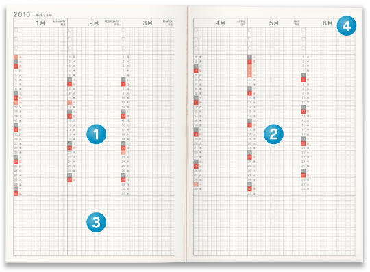 見開きの2ページで1年間の予定を見渡せた、 2009年版カズンの「年間インデックス」。 12カ月を見開きにおさめることを優先して、 1日分の書き込みスペースは、 オリジナルの「年間インデックスより」小さいものでした。 「書きたいけれど、書き切れない」 「もう少し記入欄を大きくしてほしい」 そんなご要望をユーザーの方からいただいて、 書き込みスペースを見直しました。 1ページに6カ月分の記入欄があったところ、 2010年は1ページに3カ月分としたことで、 ゆったり書けるようになりました。 見開きの2ページで半年分を見渡せるので、 長期的なプロジェクトの進行や、 年間の大きな流れを把握するのに便利です。