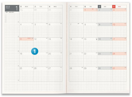 月ごとに1日ページの色が変わるのも、 「ほぼ日手帳」の特徴のひとつ。 12カ月、12種類の色を使っているため、 1日ページ以外のページの色は、 どの月の色にもかたよらないように グレーを基調にしています。 2010年は、グレーの色味を少し調整して 目にやわらかなブルーグレーにしました。 休日の赤とバランスもよく、軽やかな雰囲気です。