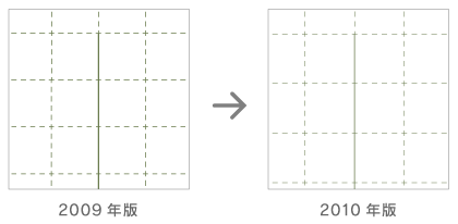 「秘密の縦ライン」とは、 時間軸から9マス目に平行に走る、細い縦線です。 ユーザーの方の使いかたにヒントを得て、 2004年版にはじめて登場しました。 以来、「予定を書く欄」と「メモや日記を書く欄」など、 スペースを分けて使うときの目安になると、 多くのユーザーの方々に利用されています。 秘密の、と名づけたのは、 自由に書きたいときにも気にせず使えるように、 うっすらと入れているからなのですが、 「スペースを分けずに使っている身としては、 まだ少し目立ちすぎる気がしています」 そういうご指摘をアンケートでいただきました。 利用している方はこれまで通り便利に使えて、 かつ、使わない方は気にならない、 そのバランスを探した結果、線の太さを 2009年版よりも0.05ミリ細く、 ミクロの世界の微調整を施しました。