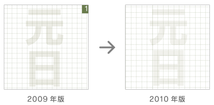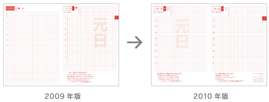 「ささいなことですが、1年のスタートは 新しいページではじめたいなぁと思います」 そんなご意見をいただきました。 2009年版の元日のページは、左ページに12月31日があり、 往く年と来る年が、ひとつの見開きになっていたのです。 たしかに! というわけで、元日を左ページに移動しました。 新しい年を、まっさらなページでお迎えください。