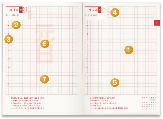 「朝が早い仕事についているので、 私の1日は午前5時からはじまります」 「日帰り出張が多いので、 朝5時台に家を出る日もしょっちゅうです」 あらゆる時間帯の予定を書けるようにと用意した 「24時間の時間軸」ですが、「午前5時」は ちょうど方眼が途切れる位置にあたっていました。 生活スタイルが早朝型の方々からのリクエストに応え、 時間軸の数字の位置をひとマス下にずらし、 午前5時台の予定を書き込むスペースを作りました。