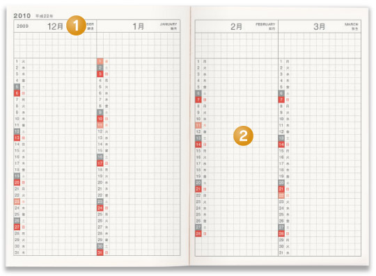 見開きの2ページで4カ月の予定を見渡せる 「年間インデックス」は、1年間の流れを把握したり、 1日ページに書いたことの見出しがわりに使ったり、 なにかと便利な予定表。 2009年版は「1月から翌年4月まで」載っていましたが、 月間カレンダーや1日ページが前年12月から使えるため (前年12月の1日ページは「2日で1ページ」仕様) 年間インデックスも足並みを揃え、 前年の12月を加えました(2009年12月〜2011年3月)。 そうしたことで、すべての機能が 「12月はじまり」の手帳となりました。
