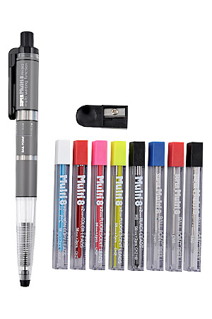 | 内蔵芯 | ボールペン(黒・赤・青)、蛍光芯(ピンク・イエロー) PPCノンコピー芯、赤芯、HB 専用替芯8種(各2本入、芯径2ミリ)・芯削り器 ※ジアゾノンコピー芯:青焼きコピーに写らないピンク芯 ※PPCノンコピー芯:普通紙コピーに写らないブルー芯 |