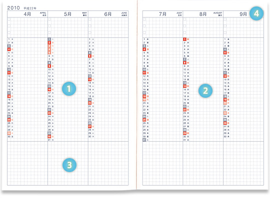 見開きの2ページで1年間の予定を見渡せた、 2009年版カズンの「年間インデックス」。 12カ月を見開きにおさめることを優先して、 1日分の書き込みスペースは、 オリジナルの「年間インデックスより」小さいものでした。 「書きたいけれど、書き切れない」 「もう少し記入欄を大きくしてほしい」 そんなご要望をユーザーの方からいただいて、 書き込みスペースを見直しました。 1ページに6カ月分の記入欄があったところ、 2010年は1ページに3カ月分としたことで、 ゆったり書けるようになりました。 見開きの2ページで半年分を見渡せるので、 長期的なプロジェクトの進行や、 年間の大きな流れを把握するのに便利です。