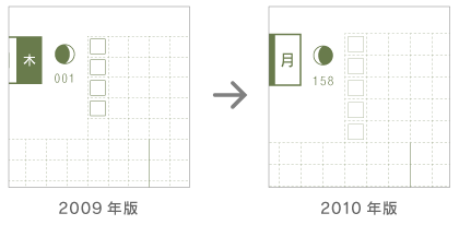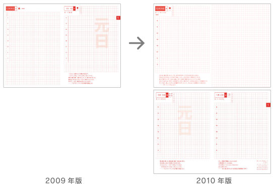 「1年のスタートは、新しいページではじめたい!」という ご意見をいただきました。 そこで、2009年版では、 見開きで、 左ページに12月31日のページ、 右ページに1月1日のページとなっていたところ、 2010年版は、 12月31日のページとなりにメモページを設けることで 1月1日のページを左ページに移動いたしました。 どうぞ新しい年をまっさらなページでお迎えくださいね。