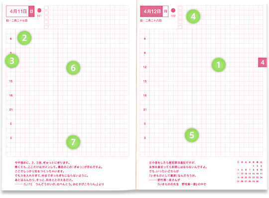 「朝が早い仕事についているので、 私の1日は午前5時からはじまります」 「日帰り出張が多いので、 朝5時台に家を出る日もしょっちゅうです」 あらゆる時間帯の予定を書けるようにと用意した 「24時間の時間軸」ですが、「午前5時」は ちょうど方眼が途切れる位置にあたっていました。 生活スタイルが早朝型の方々からのリクエストに応え、 時間軸の数字の位置をひとマス下にずらし、 午前5時台の予定を書き込むスペースを作りました。