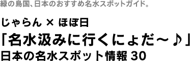 | お出かけの機会もふえる、これからの季節、 ご近所や旅先で、名水を訪ねてみてくださいね。 『名水汲みに行くにょだ〜♪』日本の名水スポット情報30が、 みなさんと「水との出合い」の きっかけになってくれたら、うれしいです。 さて、明日はいよいよ、 「ほぼ日手帳2010 spring」の すべての情報がオープンします。 どうぞ、週末にゆっくりご覧くださいね。 |