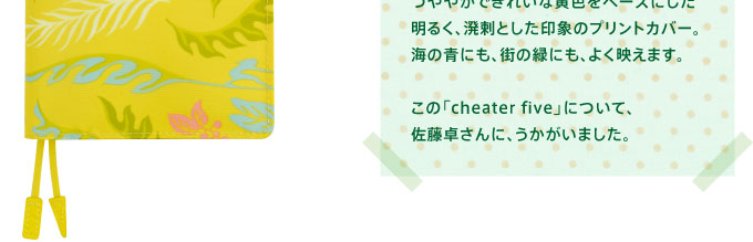 | 「cheater five(チーターファイブ)」、 「スポーツ(オレンジメッシュ)」は、 全国のロフトでもお求めいただけます。 ※カバーのみをご希望の場合は、ほぼ日ストアをご利用ください。 (ロフトでの取り扱いは、本体とカバーのセット商品のみです) |