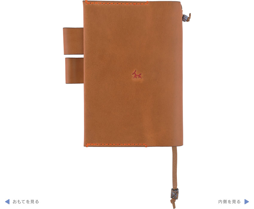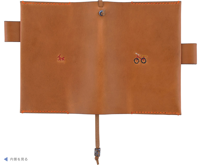 革ブランド 「HENRY CUIR」(アンリークイール)を 手がけるアンリ・ベグランさんの イタリアの工房で、 ひとつひとつハンドメイドで作られました。 「VOLUME(ボリューメ)」 (書物の「巻」「冊」などの意)という名を持つ、 刺繍とトンボ玉のついた、特別なカバーです。 明るいブラウンの「キャラメル」は、 表側には「自転車」、裏側には「犬」の 小さなかわいい刺繍が入っています。 カバーの上下に入った、オレンジのステッチと、 バタフライ・ストッパーのグリーンのステッチの イタリアンなカラーの組み合わせも絶妙です。 使い続けるほどに「味わい」を感じるカバーです。