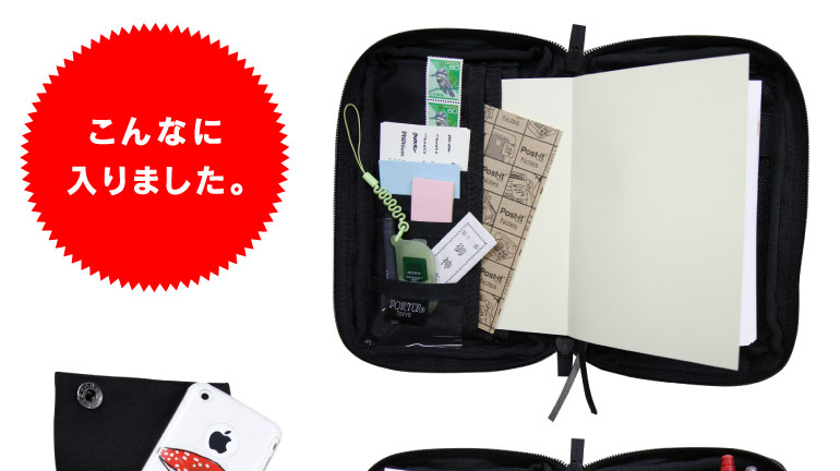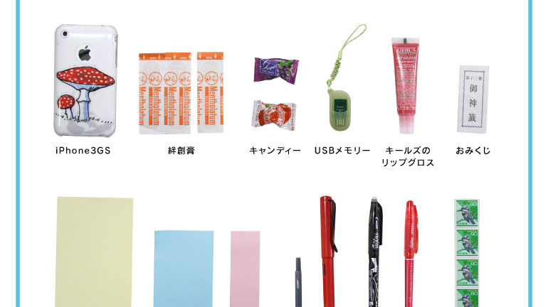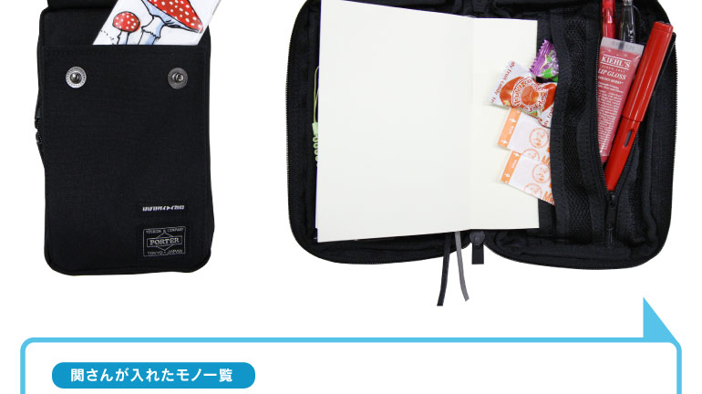 ★関さんが入れたモノ一覧 LAMYの万年筆 万年筆の替えインク フリクション(黒と赤) 80円切手 ふせん(特大) ふせん(大) ふせん(中) おみくじ 名刺 USBメモリー キャンディー キールズのリップグロス 絆創膏 iPhone3GS  ★関さんコメント 思いのほか入ったのにはビックリ! リップグロスや飴など、厚みのあるものも入っちゃいました。 編集という仕事柄、書いて消せるボールペン 「フリクション」はとっても便利。 メインで使っているのはLAMYの万年筆。 替えのインクがないと不安なので、 それもいっしょに入れられるのはポイント高いです。