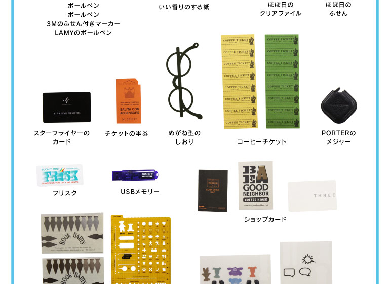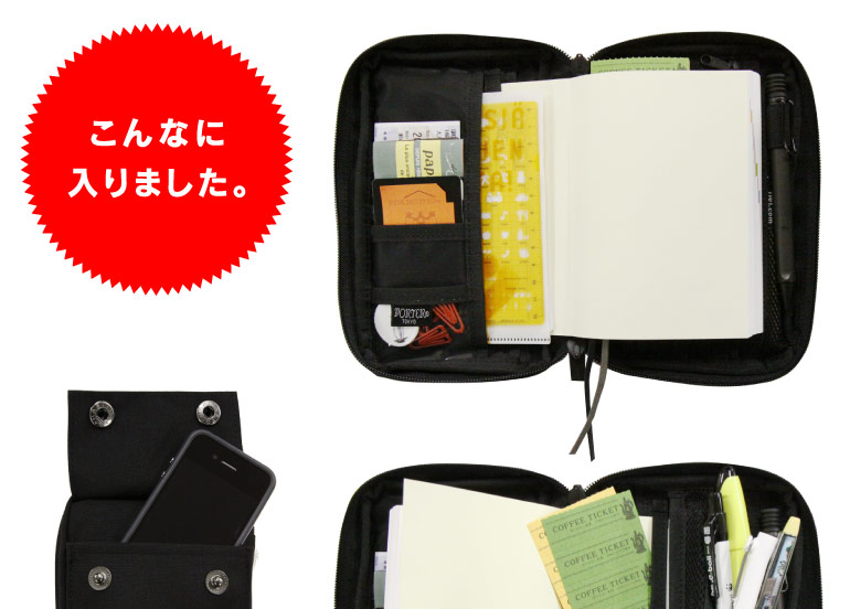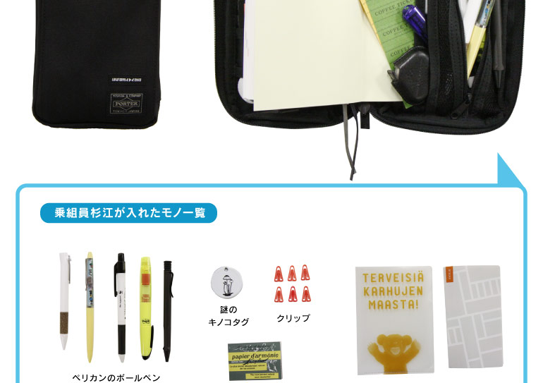 ★乗組員杉江が入れたモノ一覧  LAMYのボールペン 3Mのふせん付きマーカー ぺんてるのボールペン ボールペン ボールペン コーヒーチケット PORTERのメジャー USBメモリー フリスク めがね型のクリップ ディズニーランドのチケット スターフライヤーのカード チケットの半券 ショップカード ふせん(小) クリップ プラスマイナスゼロの計算機 謎のキノコタグ ブックダーツ ほぼ日のテンプレート ほぼ日のクリアファイル ほぼ日のふせん くまのクリアブックマーク iPhone4  ★乗組員杉江のコメント この「BLACK CASE」の開発に携わりました。 じつはこのペンケース部分、最終段階のときに 「やっぱり、必要!」と思ってつけたものなんです。 一般的な太さのペンなら5本くらい入るので 筆記用具をよく持ち歩く人にも うれしいカバーだと思います。