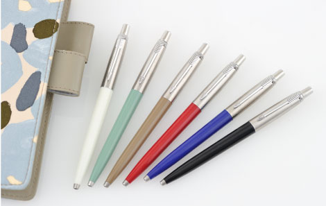 新しいスタートの季節、 「手帳といっしょに使う文房具も新調したい」 という方もいらっしゃるのではないでしょうか。 パーカーのボールペン「ジョッター」は、 「すぎえ文具」を担当する、ほぼ日乗組員スギエが 「どんなカバーにも似合う!」という理由で えらんだニューフェイスです。 ちょっぴりクラシックなカラーと質感は、 どのカバーとあわせても、不思議なほど相性ぴったり。 矢をイメージしたクリップ部分もすてきです。 もちろん、書き味もばつぐんなんですよ。
