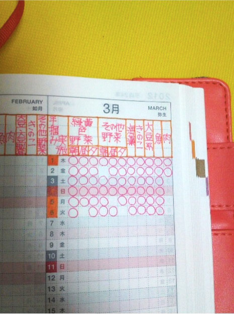 「年間インデックスに野菜や肉や大豆などのチェック表。」