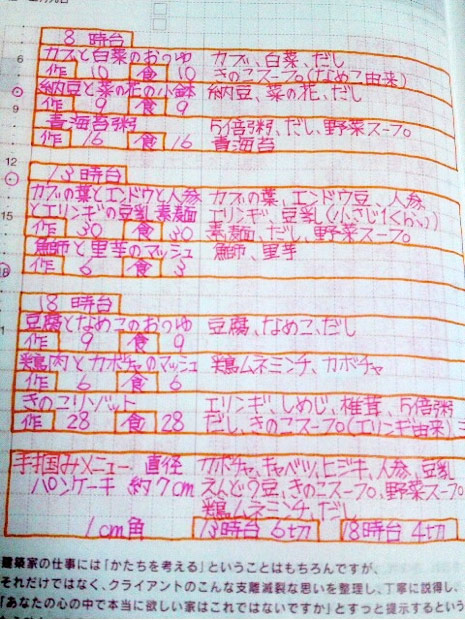 「1日ページに食べたメニュー、時間、量を書いています。」