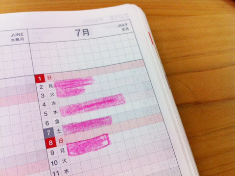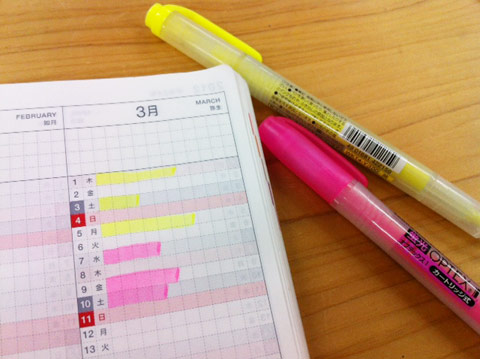 その日の勉強時間を蛍光ペンで塗りつぶしています。