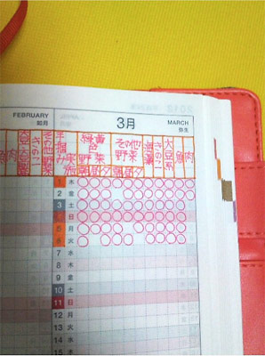 年間インデックスに野菜や肉や大豆などのチェック表。