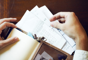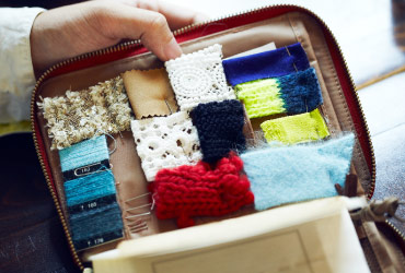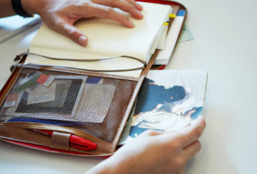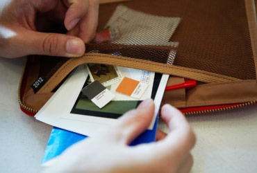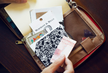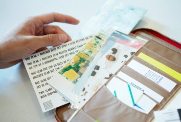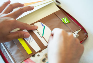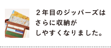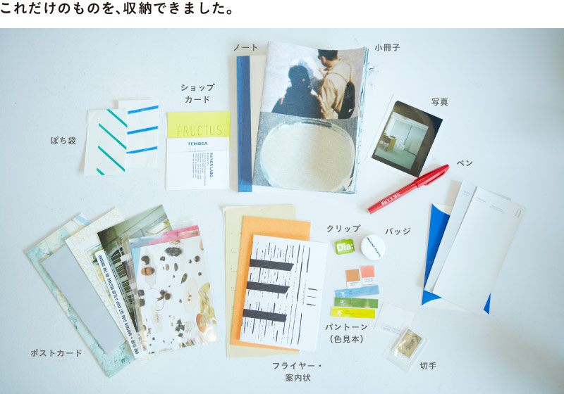 江藤さんが使うジッパーズには 仕事道具でもあり、すべてのプロダクトの中で 最も惹かれるという「紙」のアイテムが詰まっていました。 「普段は、DMなど届いたものとか、資料とか、 たまってくる紙類は、書類入れに入れたりせずに、 無造作にノートの間に挟んでいるんです。 ジッパーズにも、それと同じ感覚で いろいろと入れてみています」