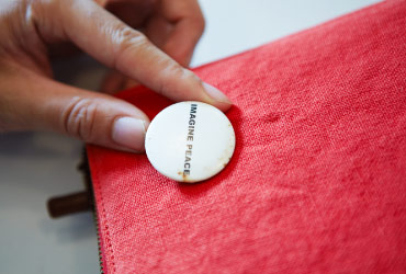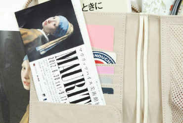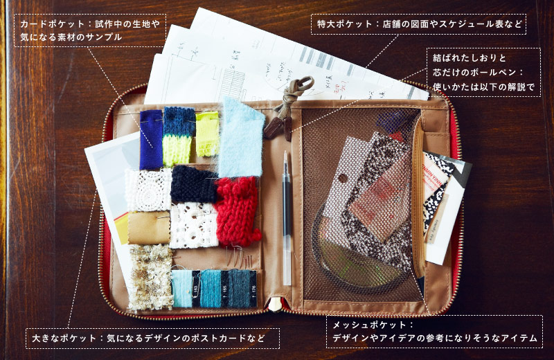 欠かせないそうです。 試作中の生地サンプルや、 山小屋でスタンプを押すためのノートもここに。 特大ポケットならではの収納力が生きます。