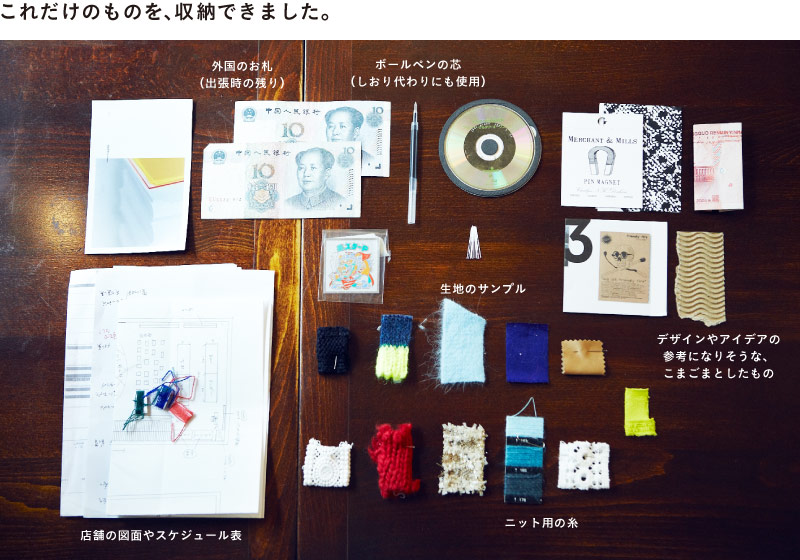 そんな大江さんのジッパーズの使いかたは かなり個性的。 「会社の仕事でも、自分のプロジェクトでも、 発想のヒントとか、デザインのアイデアとかを つねに探しているので、 そういうインスピレーションがわくようなものを いろいろと詰めてみました」