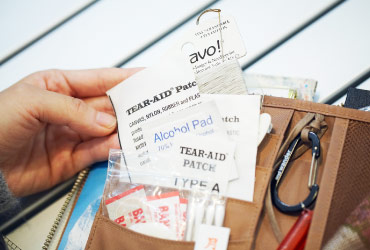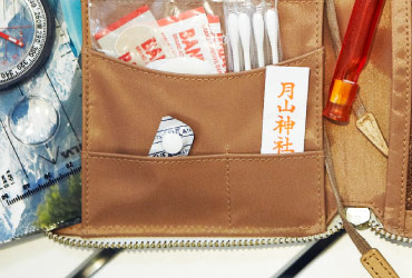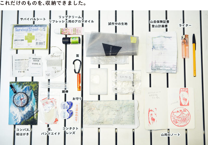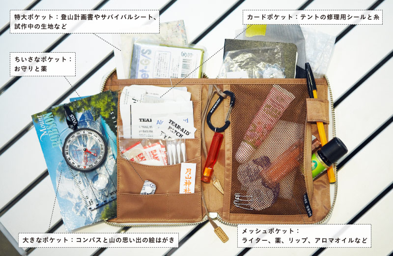 今回、使っていただいたジッパーズにも 山で使用感を試すための生地のサンプルをはじめ、 登山に欠かせないアイテムを、 ぎっしり詰めてくださいました。 ※手帳本体を装着せず、ジッパーズを ポーチとして使った場合の使用例です。