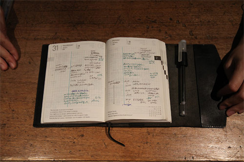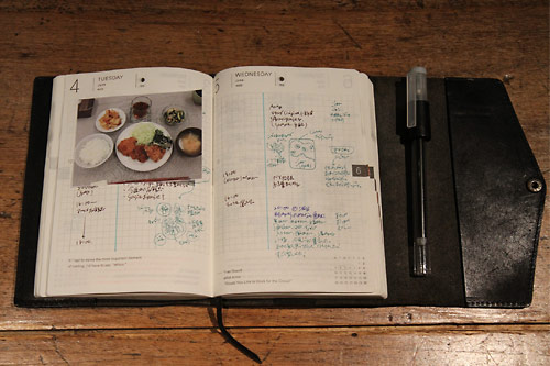 | 藤村 | はい。黒が「仕事関係」で、 青が「プライベートの予定」、 緑が「日記とそれ以外のこと」を書くのに使ってます。 また、具体的には 右上に「今日やること」のTO DOを書いて、 右下に、スケジュール。 あと、余白に日記を書いたり、 朝昼晩の食べたものをつけたり。 そんな感じで使用していることが多いですね。 |