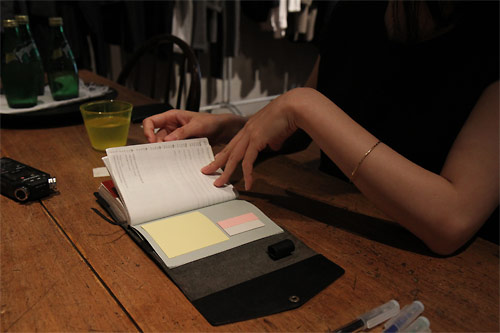 | 藤村 | 特に便利だなと思っているのは、 「すべてが1冊にまとまること」ですね。 私、今年の Hobonichi Planner で初めて 1日1ページタイプの手帳を使ったのですが、 打ち合わせのときに、メモなどをすべて ここに書いておけるのが、こんなに便利なんだ、と思って(笑)。 どのノートに書いたかわからなくなったり、 メモをなくしたりする心配もないし。 今はここに、すべての情報をまとめたいな、 と思っているんです。 |
