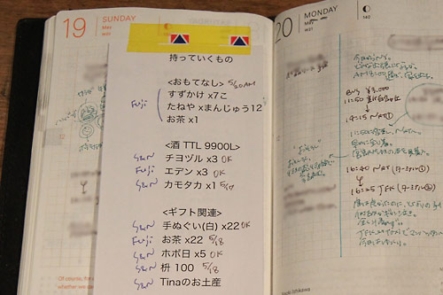 | 藤村 | これは出張に持っていったお土産リストです。 出張中はなぐり書きで1日の行動を記録しておき、 帰ってきてから、書き直しました。 これが後々レポートを書くのに役立ちました。 あと、バレエのチケットを貼ったりとか。 |