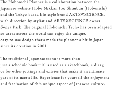 - Embossed inside the cover is an original logo to commemorate the collaborative efforts of Hobonichi and ARTS&SCIENCE.