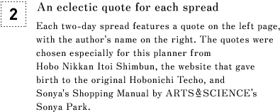 ![[2] An eclectic quote for each spread Each two-day spread features a quote on the left page, with the author's name on the right. The quotes were chosen especially for this planner from Hobo Nikkan Itoi Shimbun, the website that gave birth to the original Hobonichi Techo, and Sonya's Shopping Manual by ARTS&SCIENCE’s Sonya Park.](images_e/string_mc_list_02.gif)