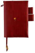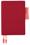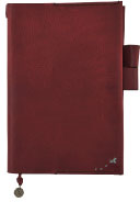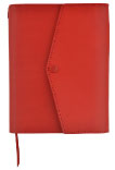 | 上品な赤い革のカバー。ぜひクラッチバックのように、表に出して持ってもらいたいです。華やかな赤が、使ううちにすこしずつ落ちついた赤に変化していくのも魅力です。(担当T) |