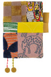 | ミナのオリジナル生地をたくさん集めて縫い合わせたカバー。パッチワークを構成する、素材や加工が異なるテキスタイルは、それぞれの特性や柄ゆきを見極めながらひとつひとつ手作業で裁断し、ミシンをかけています。(担当M) |