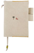 | アンリさんから提案いただいてできた、2014年初登場のさわやかな白い革のカバー。ヤシの木と犬の刺繍はもちろん、使い込むとつややかなクリーム色に変化していくこの革ならではの感じも、また素敵です。(担当M) |