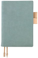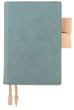| 水色の革カバーです。ヌメ革ほどではありませんが使ううちにブルーがだんだんと風合いのある美しい色に育っていきます。内側のヌメの経年変化とともに、おたのしみください。(担当S) |
