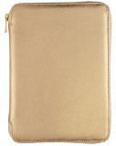 | キラキラと輝くシャンパンゴールドのジッパーズ。本革にゴールドの箔加工をすることで、きれいな光沢感を持たせました。クラッチバックのようにも見える上品なカバーです。(担当S) |