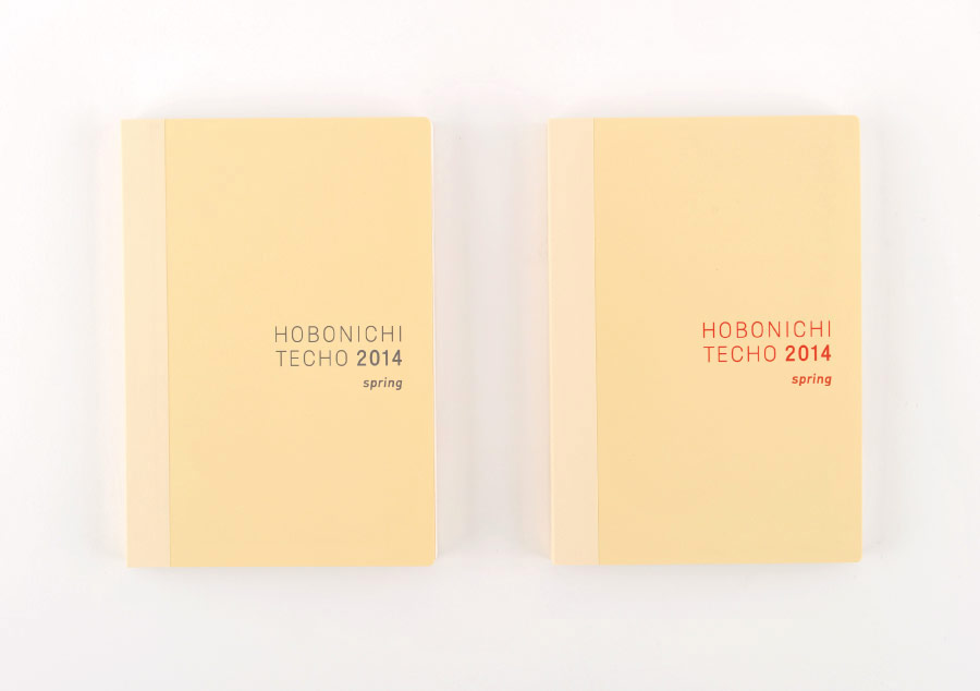 表紙の中央右に、 月曜はじまりは「グレー」で 日曜はじまりは「レッド」で 「HOBONICHI TECHO 2014 spring」と印字しました。