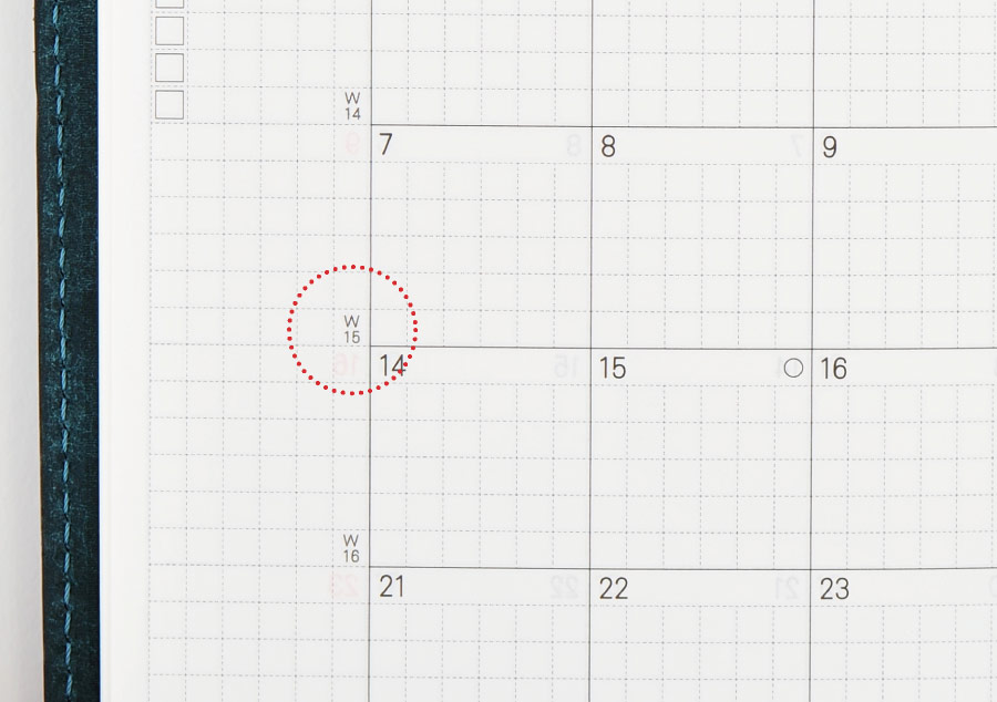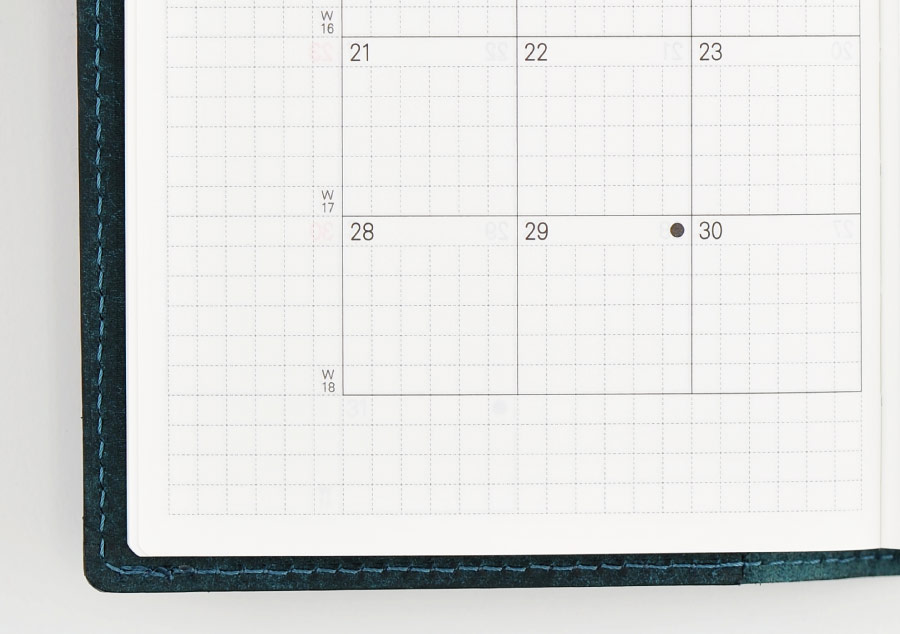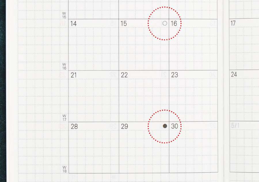 While the daily pages feature illustrations of the moon phase of that particular day, the monthly calendar only includes new moons (●) and full moons (○).