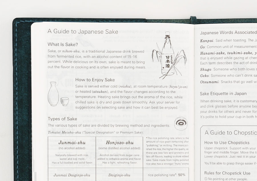 We’ve included a guide to the basics of Japanese sake, with a glossary of terms for the various kinds. The page also features a section on using chopsticks.