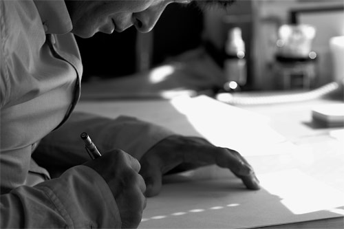 Once the sketch for an embroidery pattern is complete, Minagawa heads right to the lace factory. He meets with Satou to show his concept and discuss how they can create something true to the sketch. Minagawa tells us how important it is that they meet face to face so they can use both images and words to bring the image together.