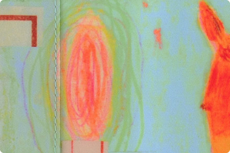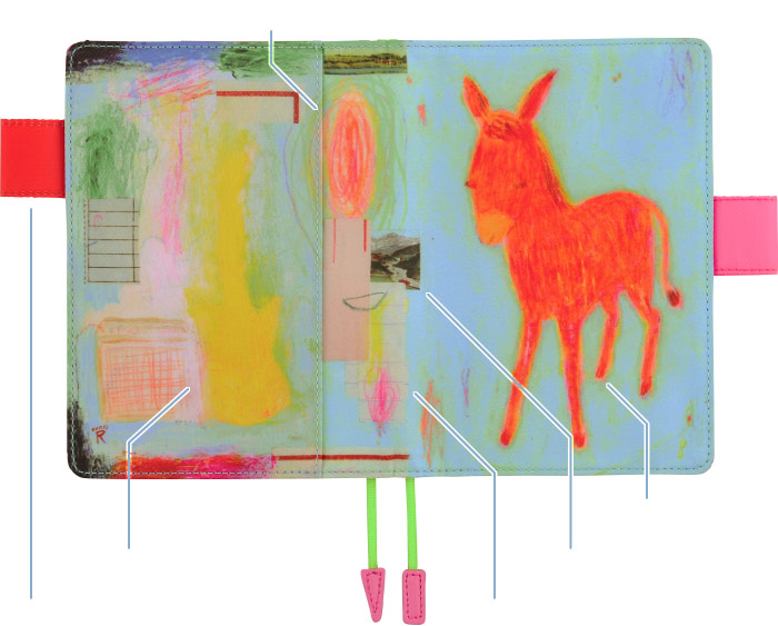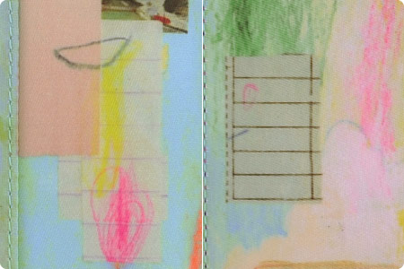 I put together a collage of ripped notebook paper from a children's notebook, sun-bleached washi stationary paper, and a traveling ticket from India. I think a techo usually turns into a jumbled mess of work plans and private diaries, so I wanted to get a head start making a cover that stimulated the imagination of its user before they even start using it.
