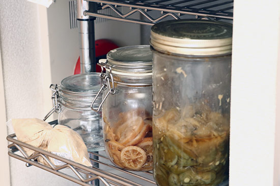 ▲シェアハウスの台所には、作りおきの材料が並びます。