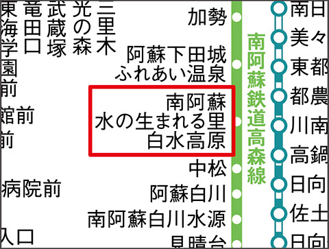はい。九州は変わった駅名も多くて おもしろかったんです。 「南阿蘇水の生まれる里白水高原駅 (みなみあそみずのうまれるさと はくすいこうげんえき)」とか。 |