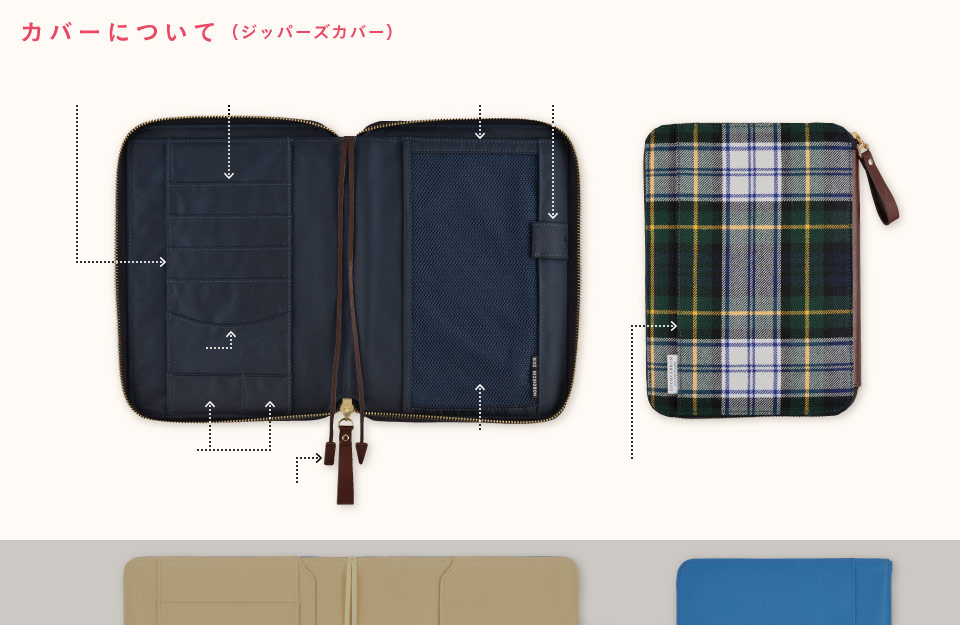 カバーの外側と内側の生地の間に いちばん大きなポケットがあります。 A4サイズの書類を折り曲げるかたちで収納できます。