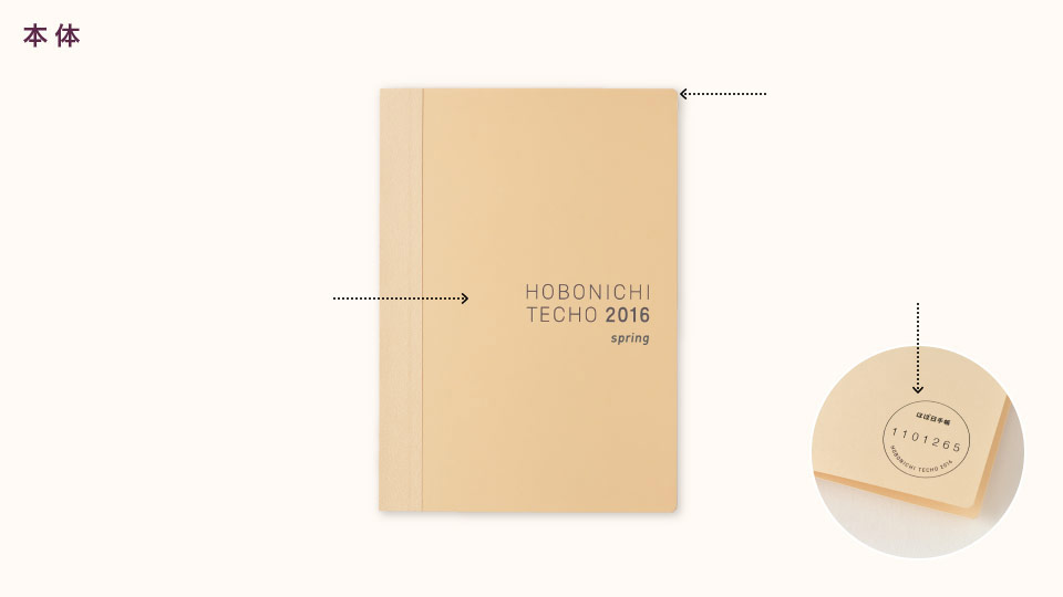 表紙の色は、やさしい色合いのアイボリー。 月曜はじまりは「グレー」、 日曜はじまりは「レッド」で 「HOBONICHI TECHO 2016 spring」と印字しました。