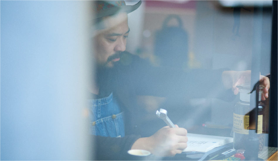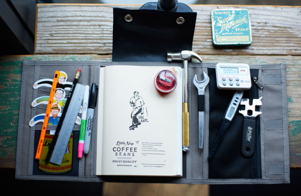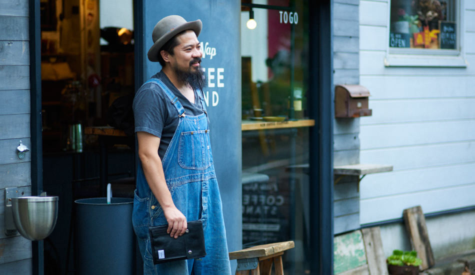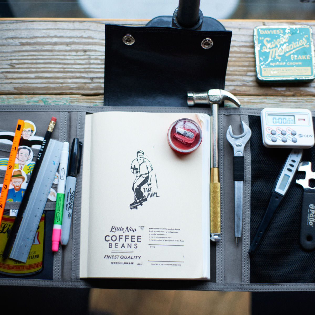 LITTLE NAP COFFEE STAND 濱田大介さん/代々木公園のそばにあるLITTLE NAP COFFEE STANDのオーナーバリスタの濱田さん。コーヒー豆の特質やその日のコンディションに合わせて、エスプレッソマシンを調整するのも濱田さんの仕事。豆の産地をメモするノートに工具類が収納できるポケットが付いたツールポケットは、とても使い勝手が良さそう。