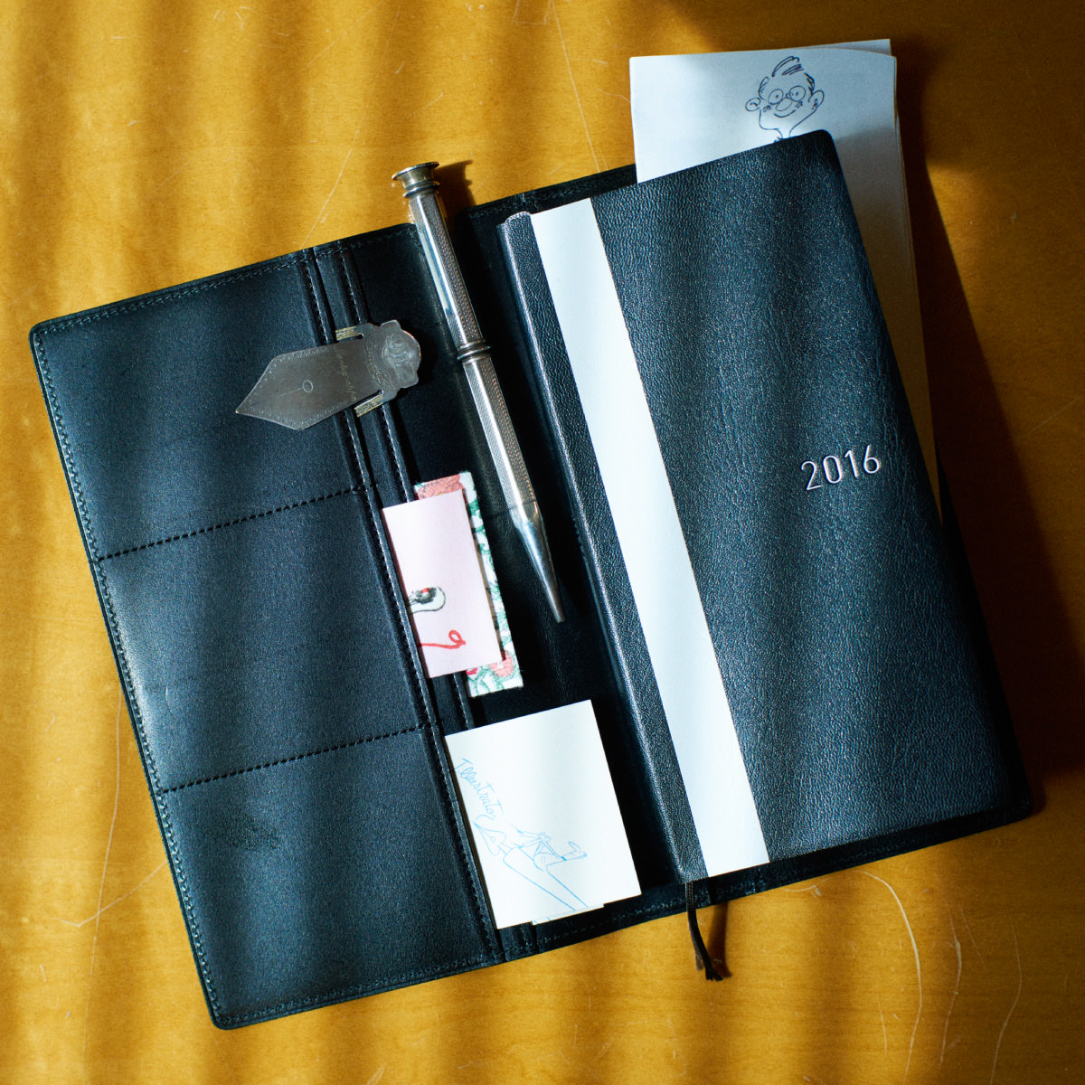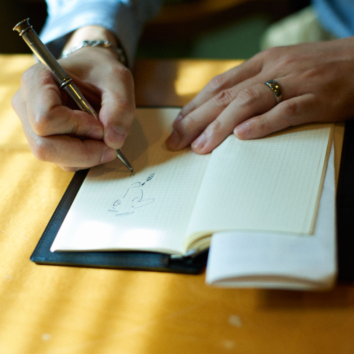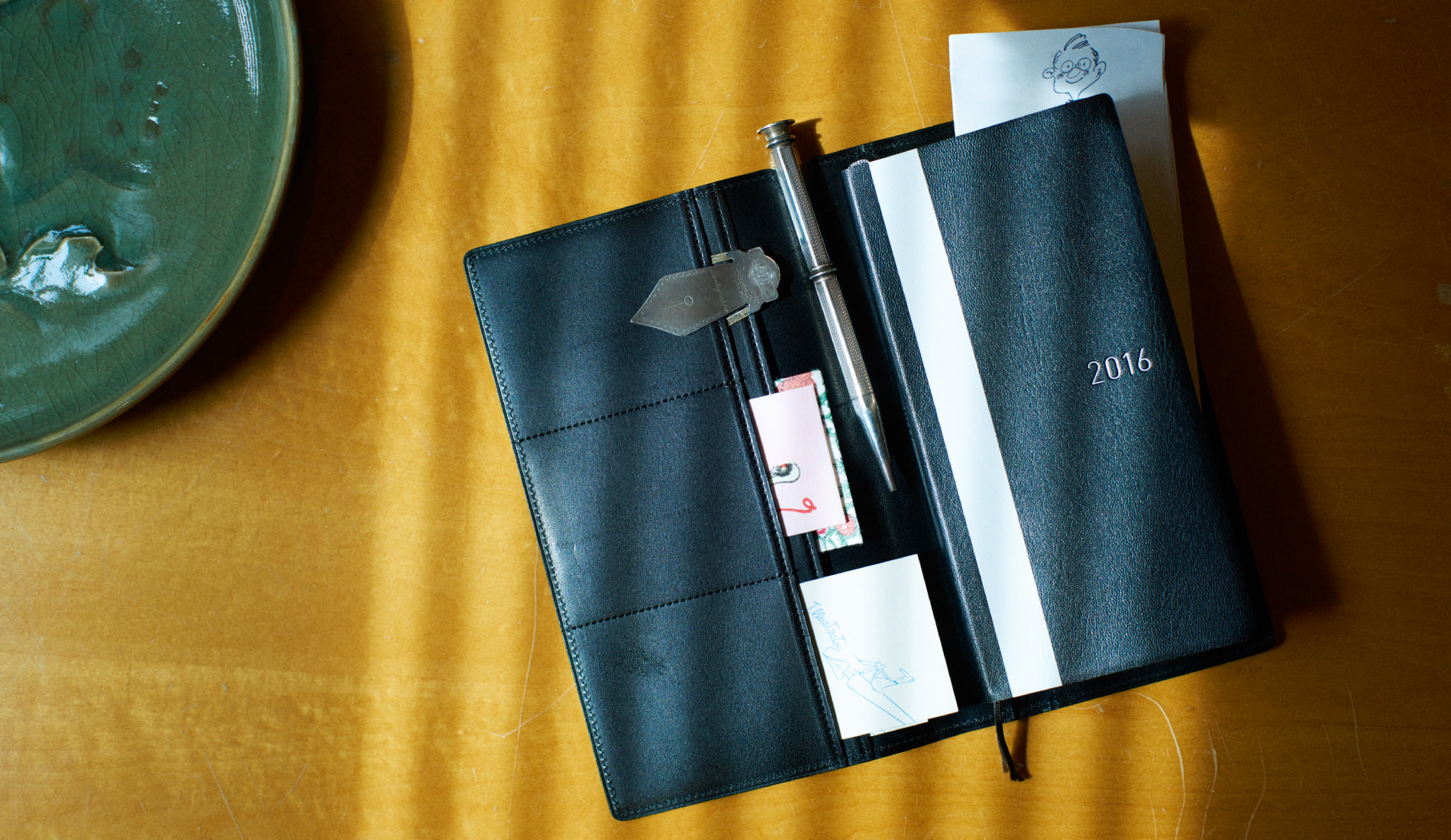 イラストレーター ソリマチアキラさん/1991年よりフリーランスとして活動するイラストレーター。お洒落でどこか懐かしい大人の世界を描いた作品が国内外で人気を博している。長年愛用する手帳には、日々のスケジュールはもちろん、これまでに手掛けた仕事やイラストの下書きなど、ソリマチさんの長いキャリアがぎゅっと詰め込まれている。