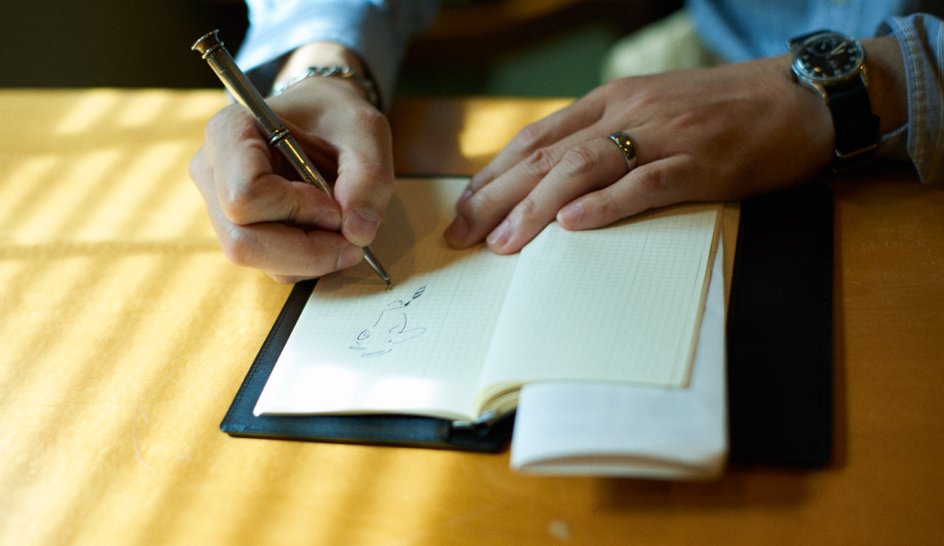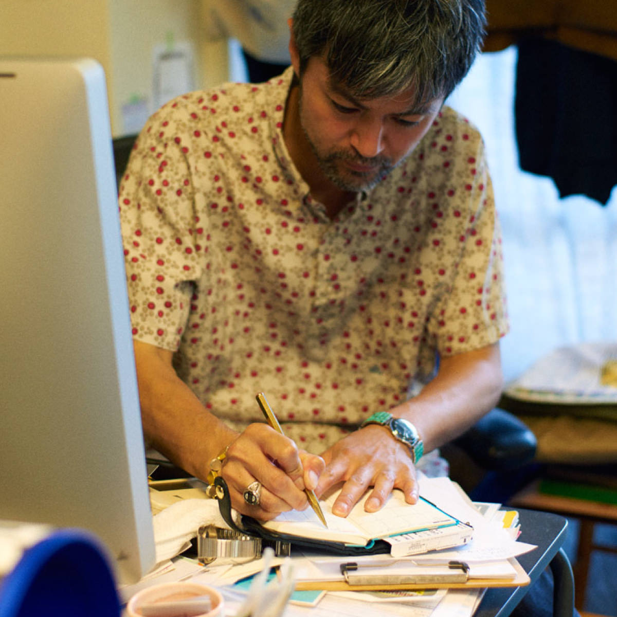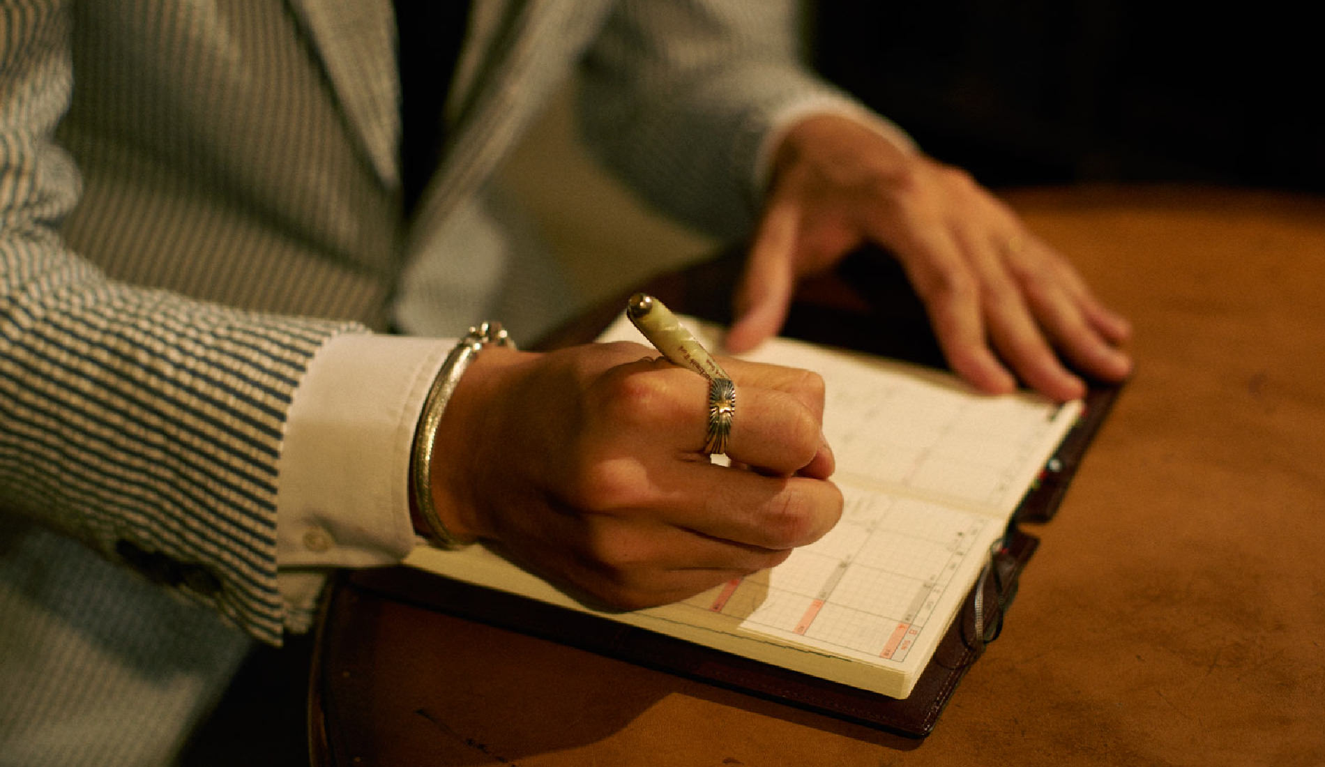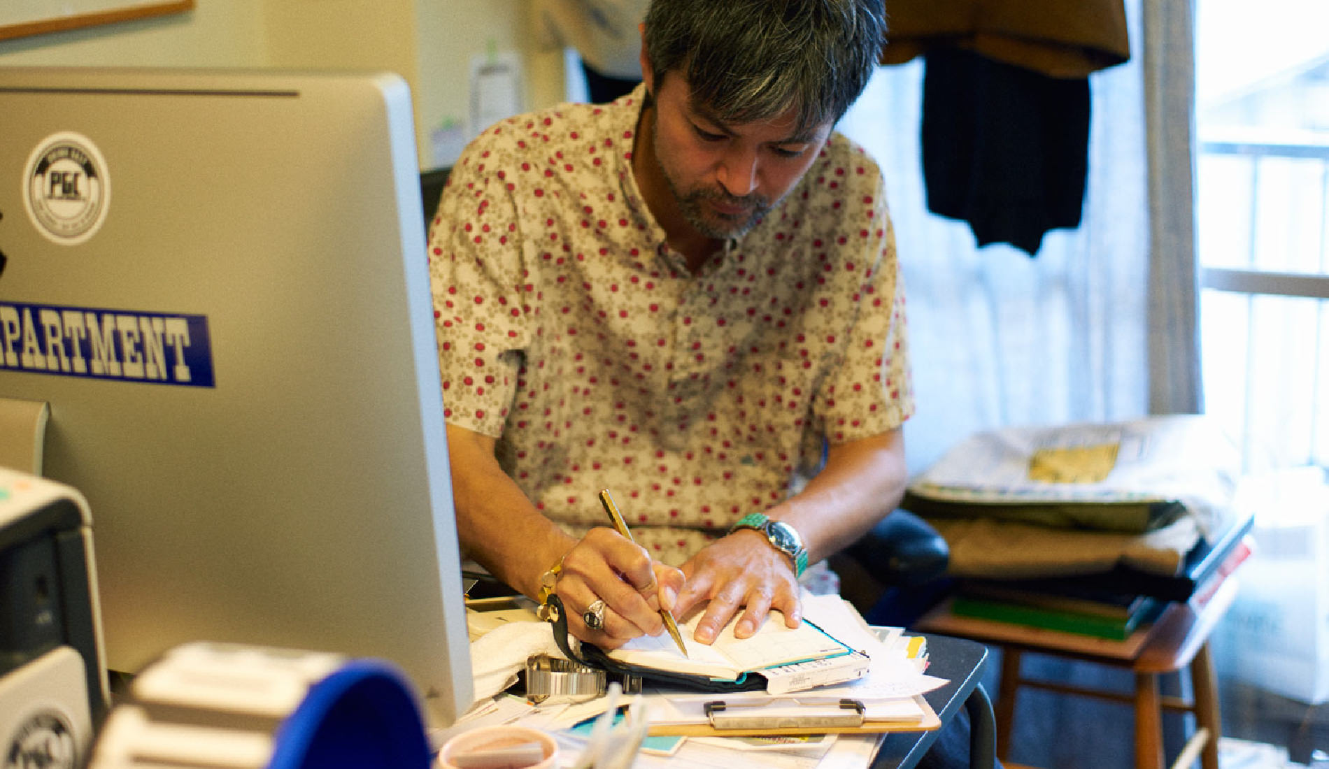 Swimsuit Department 郷古隆洋さん/世界各地の蚤の市やオークションで買い集めた民芸品やオブジェクトを揃えるSwimsuit Departmentのオーナー郷古さん。年に数回ある買い付けでは、すぐにレシートが膨大な量になってしまうため、こまめに品名と値段を手帳に控えているそう。郷古さんにとって、手帳とは旅のパートナーでもあり、仕事のパートナーでもあるのだ。