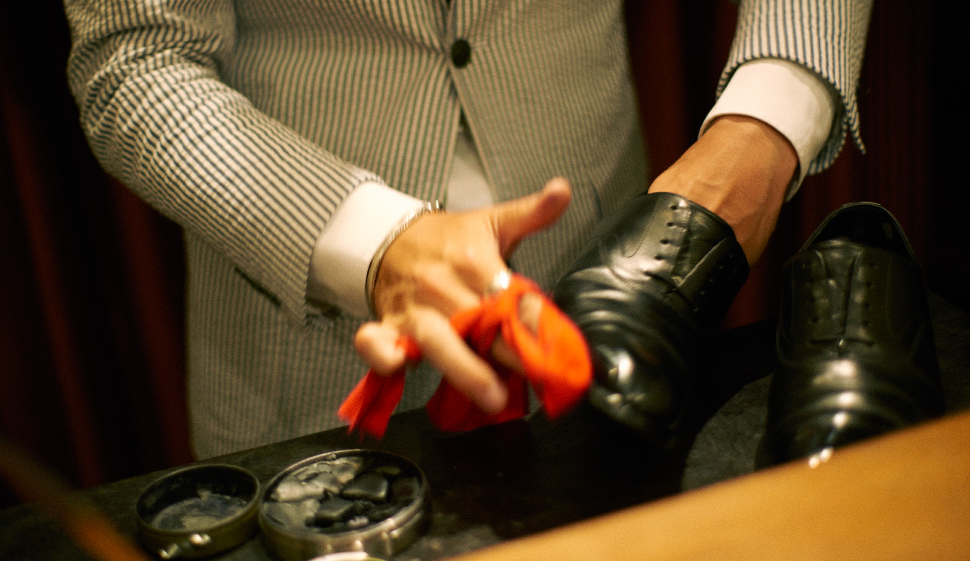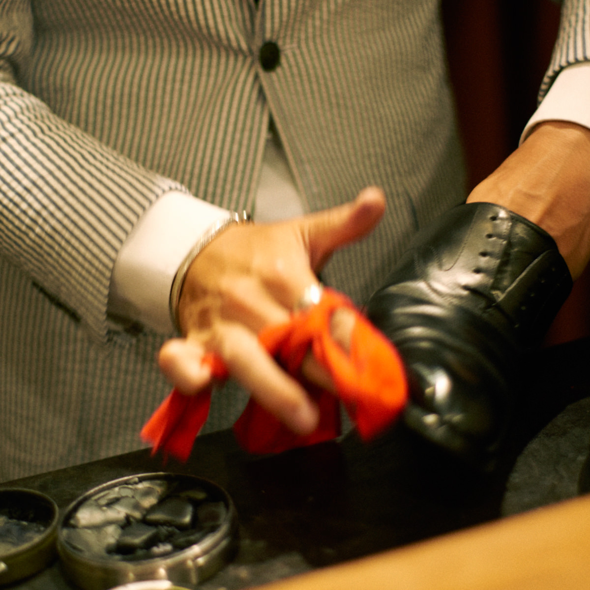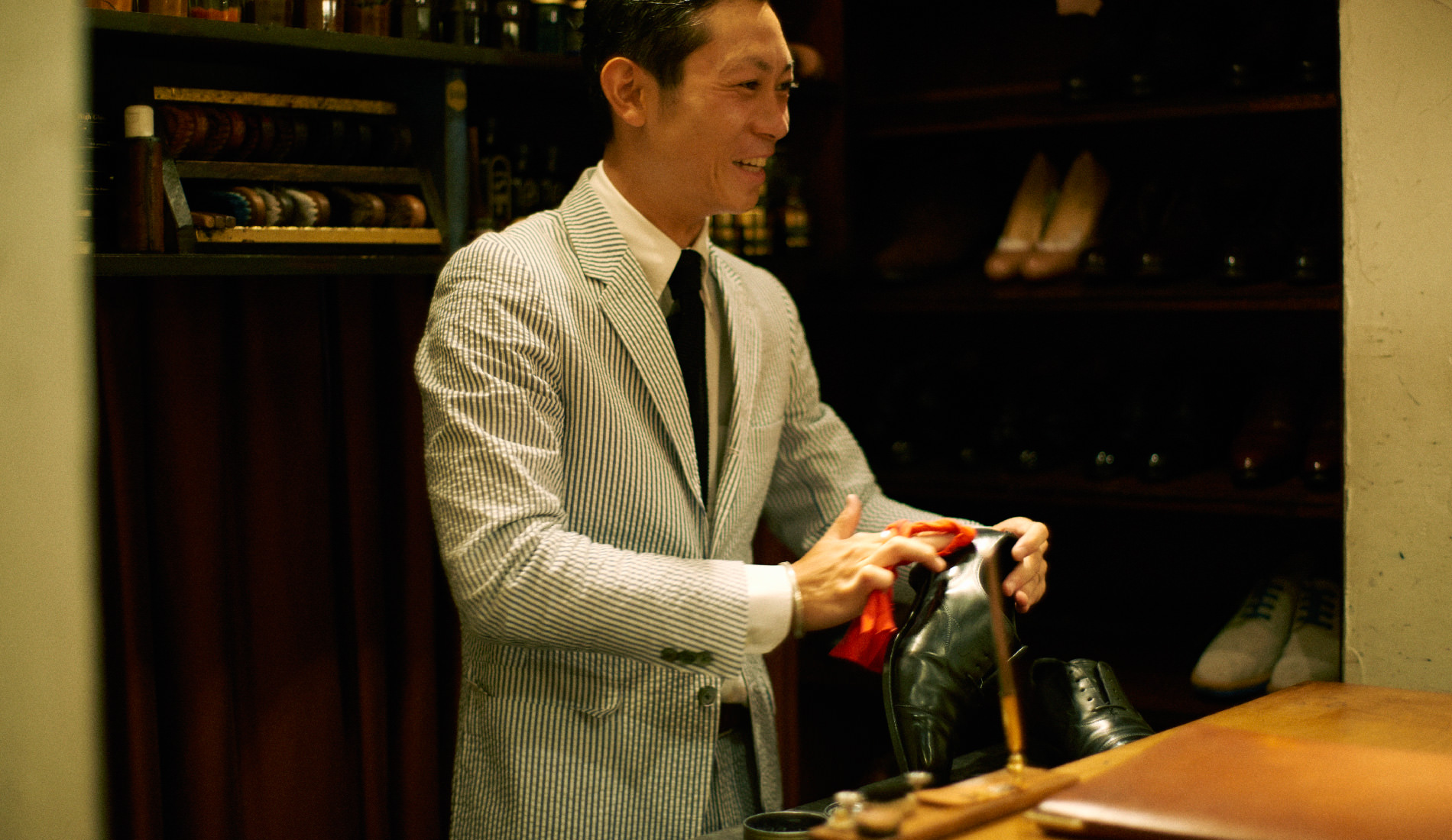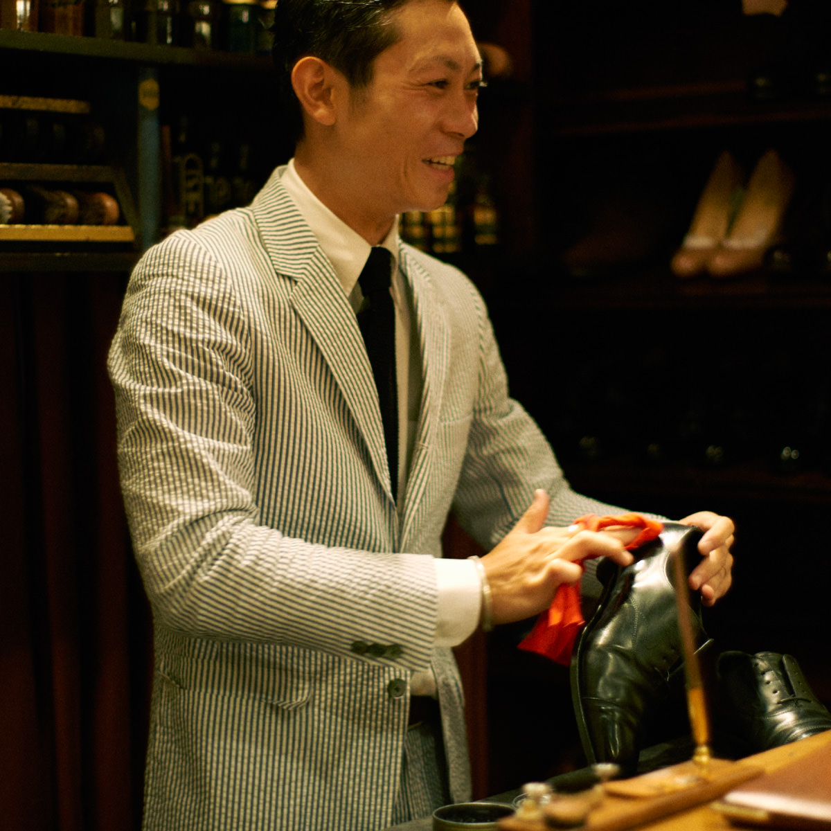 Brift H 長谷川裕也さん/路上での靴磨きからキャリアを積み、2008年にシューズラウンジBrift Hをオープンした長谷川さん。お店では、靴磨きからコバの削り直し、さらには革の染め変えまで幅広く対応してくれる。「良い革を使っていますね。使い込むこむことでどんどん良い味が出てきますよ」と、パスポートカバーにご満悦の様子。