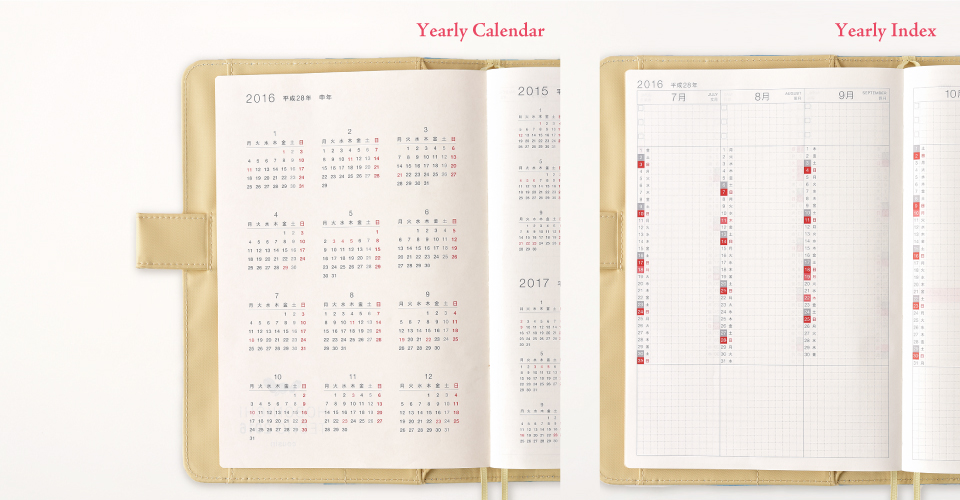 A convenient double-page spread shows the yearly calendars for 2016 and 2017 at one glance as a useful reference when planning ahead. Days are neatly fitted into one square each.